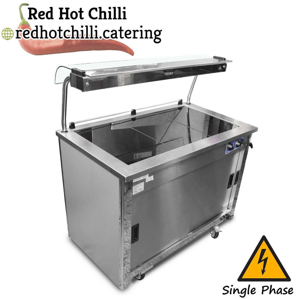 This Hot top servery with 3 x thermal panels, designed to accommodate 1.1 GN, and a fan assisted hot cupboard is excellent for storing hot food or plates ready for serving. The energy efficient solid hot top and hot cupboard work in sync by using residual heat from the hot cupboard whilst the heated gantry helps to keep the food warm from above. It is designed to maintain pre-heated, cooked food at a regulated temperature and is suitable for the display of most types of hot foods.