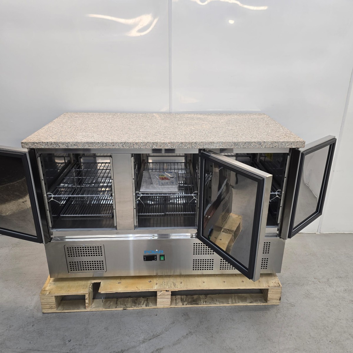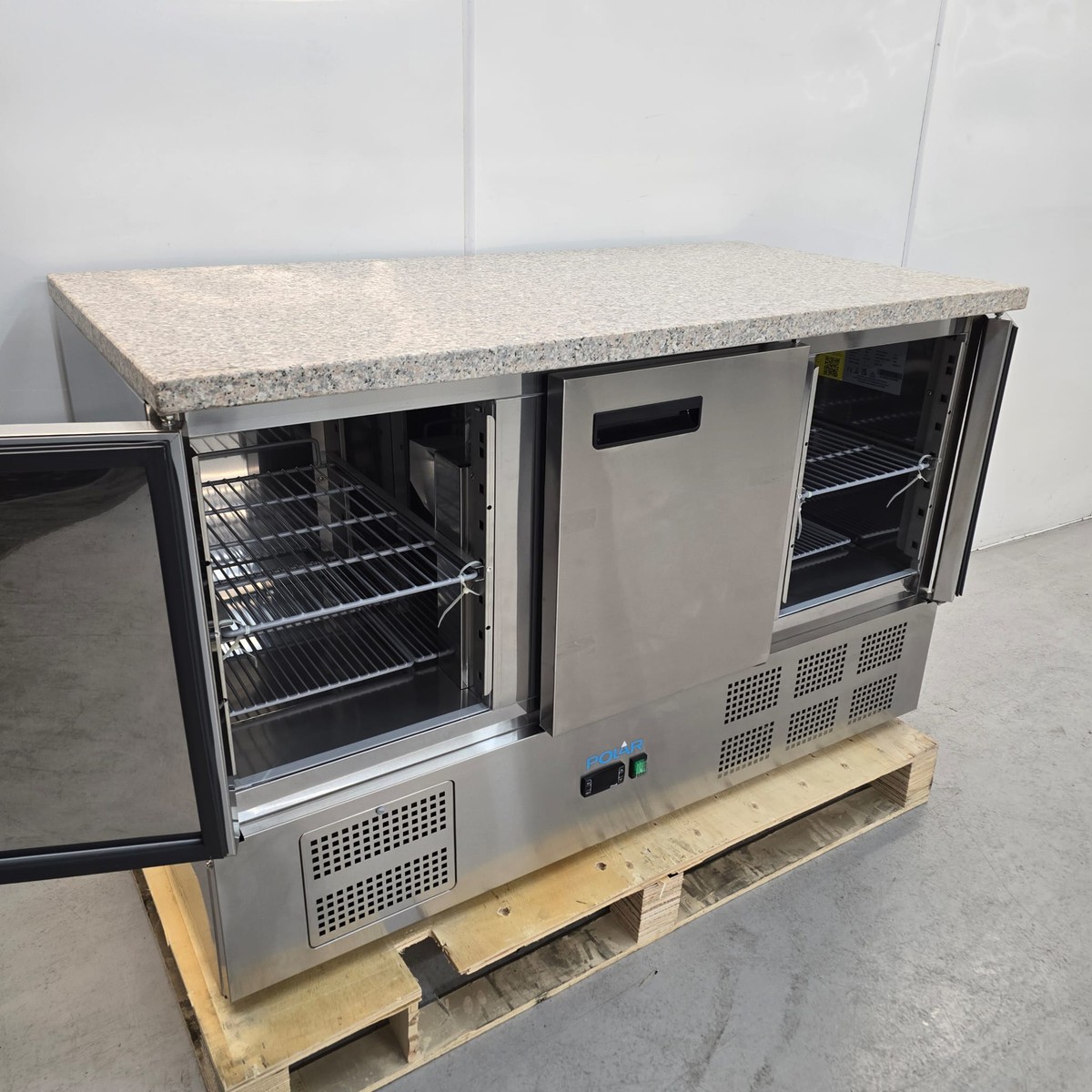 With a full 308 litres of usable refrigerated storage across three stainless steel doors, the Polar G-Series prep counter offers more than enough reliable storage space for storing large quantities of rapid-access ingredients.On top, the counter features an incredibly durable and robust stay-cool granite work surface, perfect for prepping pizza, making sandwiches or kneading bread dough. And inside, the adjustable shelves provide plenty of storage flexibility, with space for up to nine full-size gastronorm pans behind the three doors – ideal for positioning your most-accessed ingredients just where you want.