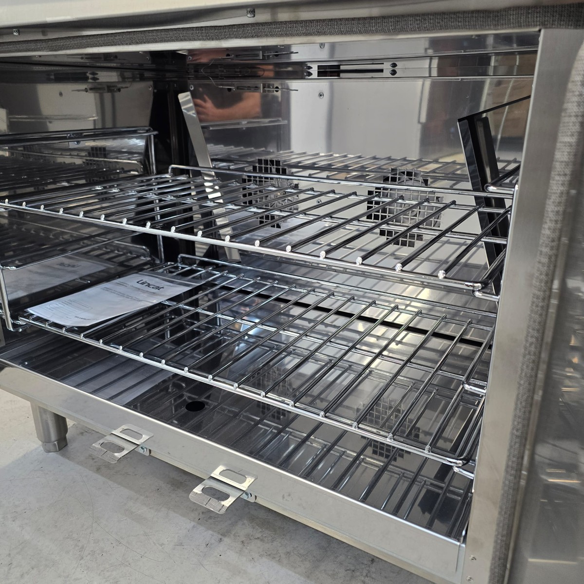 Double-insulated side-opening doors efficiently keep heat in the oven