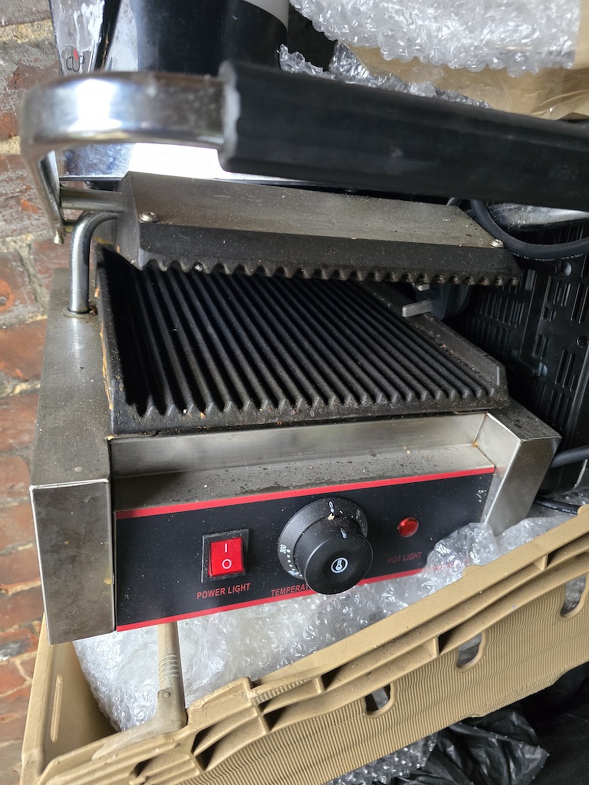 A huge selection of ex-pub kitchen equipment, including Fryers, Griddles, Sandwich makers, trolleys, lighting shades, Dinner Plates (Square), side plates, Cups, Saucers, Qty of Black Dinner plates, Dishes, mixing bowls, various sizes. Microwaves, griddle, Cutlery, Cutlery trays, saucepans, roasting tins, ramekins, 6 pot Ban Marie plus loads more, approx.50 boxes of items plus loose items, most of which were purchased new from Nesbit's, they have been in storage for approximately 5 years and were in use for approximately 18months.