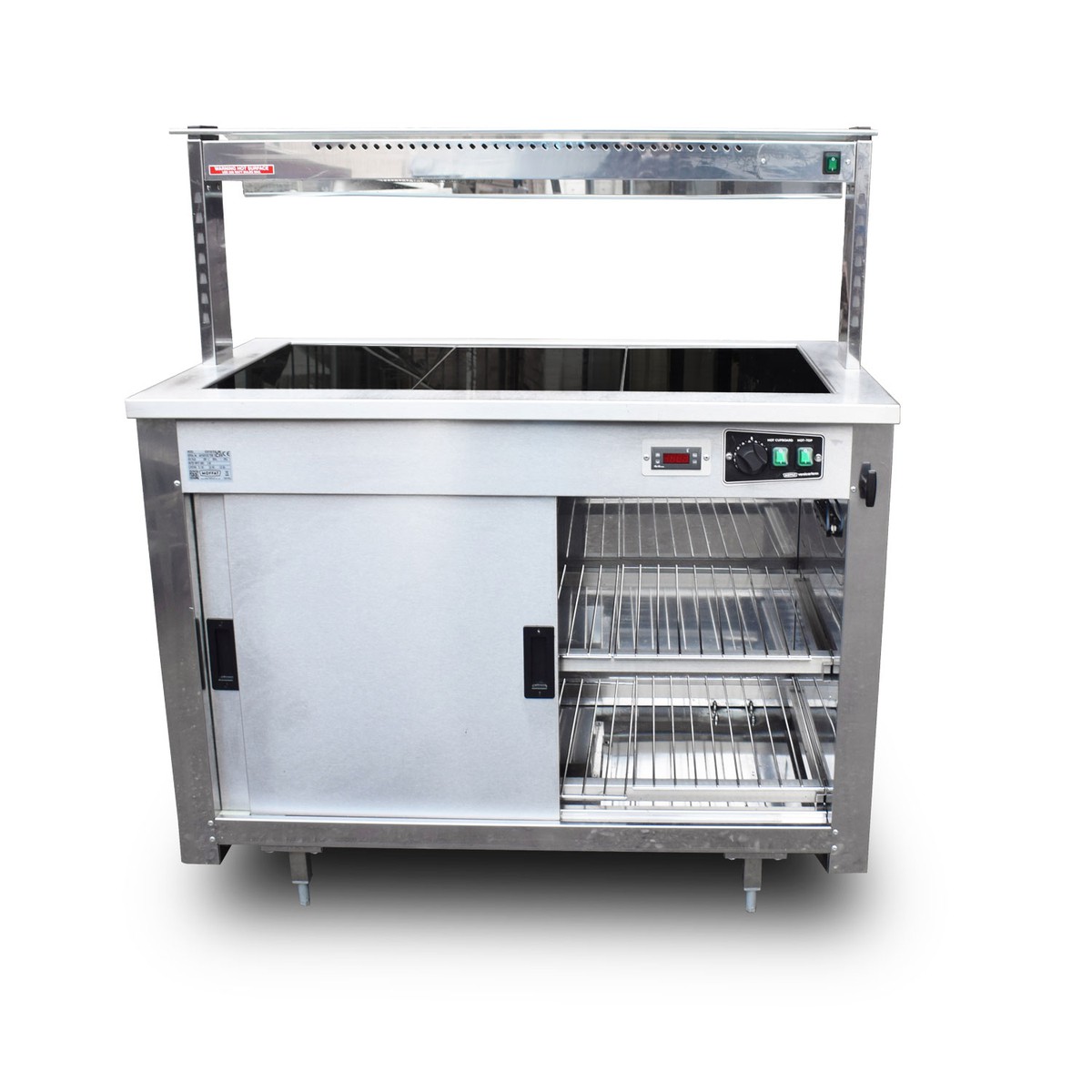 This Moffat Hot Top Servery is a mobile heated food service counter, designed for holding and serving pre-heated food at a regulated temperature.The unit is designed for use in various commercial catering environments such as and allows for food to be kept warm for extended periods, using a forced-air heating and recirculation system within the hot cupboard section and independent heat for the top.