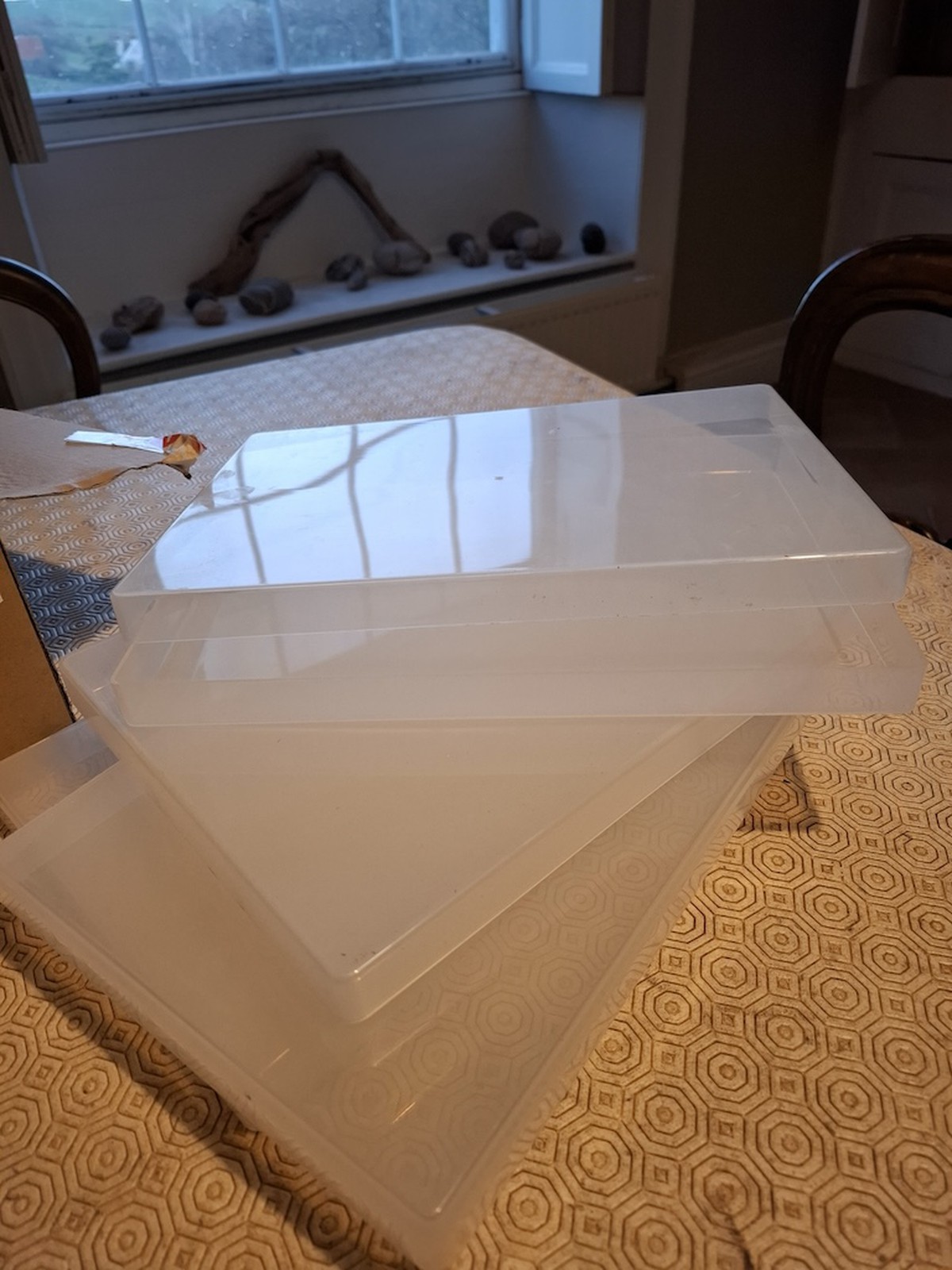 Chocolate bon-bon / bar storage boxes with lids for storing chocolates at room temperature, refrigerated or frozen.Each box is 30cm (length) x 22cm (width) x 2cm (height) - A4 size