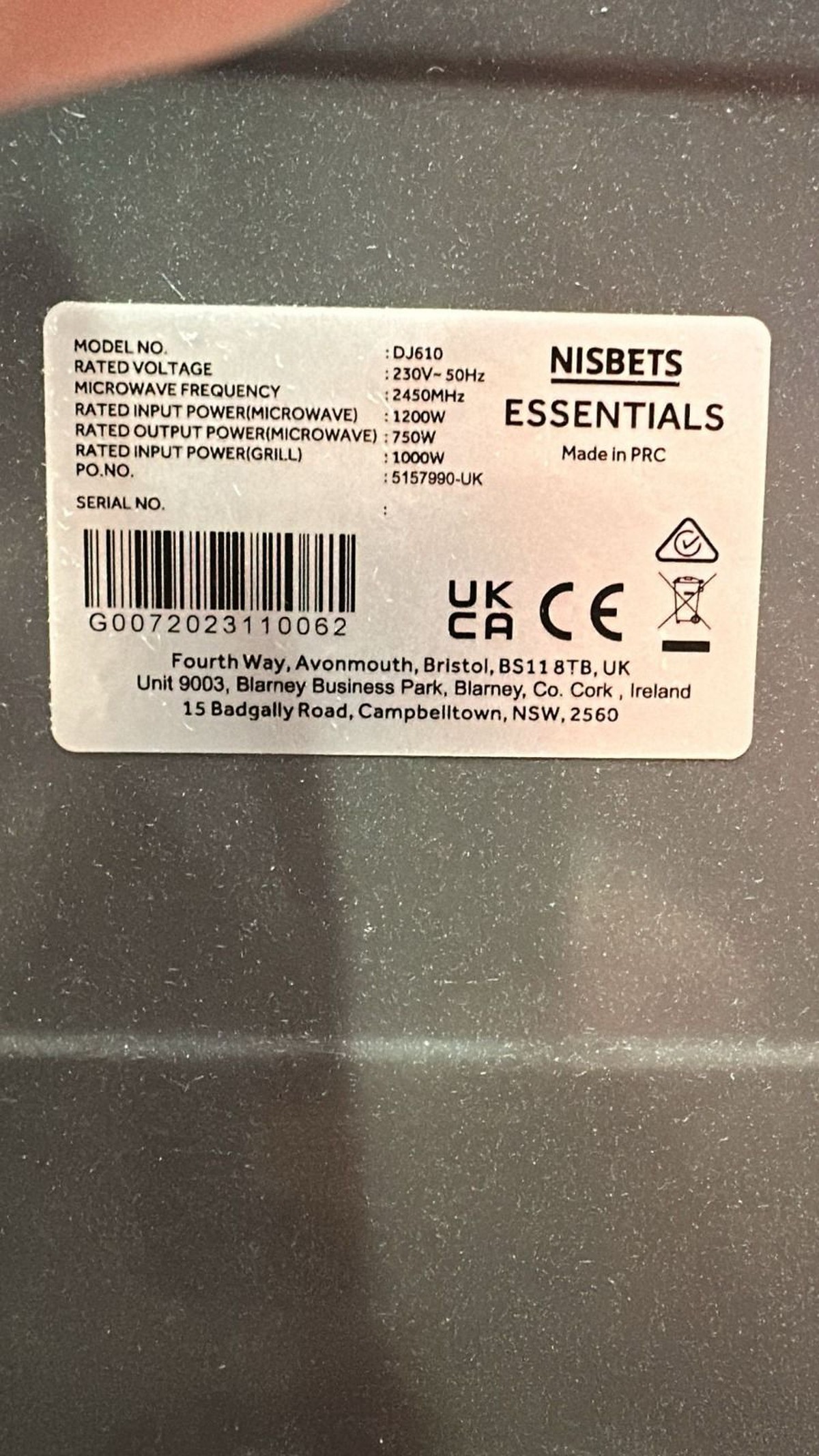 Nisbets Essentials DJ610 Microwave with Grill – 750W – BlackCondition: Used – good working order