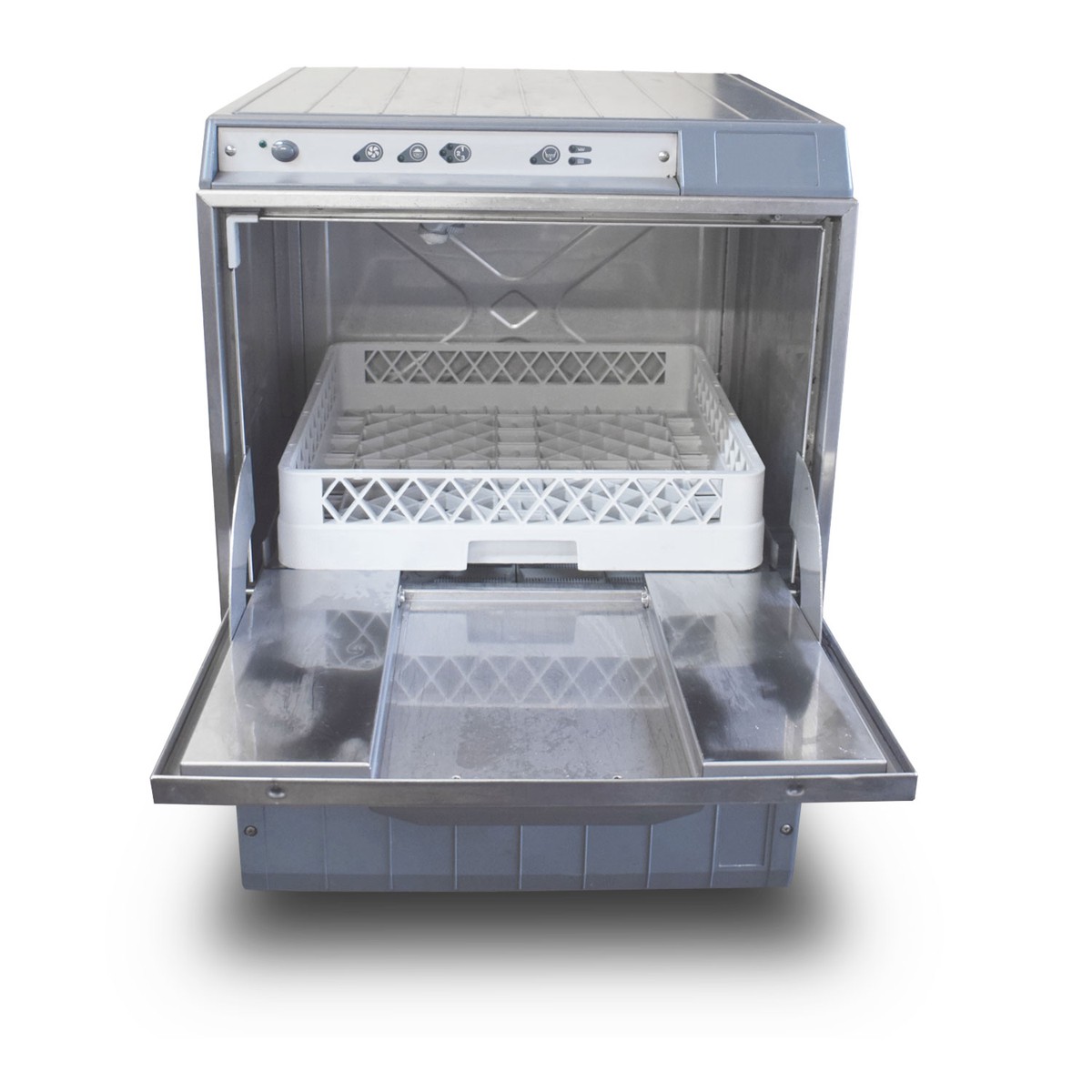 The glasswasher features an integrated drain pump, detergent and rinse aid pumps and a safety system that ensures the machine only starts when the correct rinse temperature (typically 85°C) is reached for sanitisation. Comes complete with 500x500 dishwasher basket.