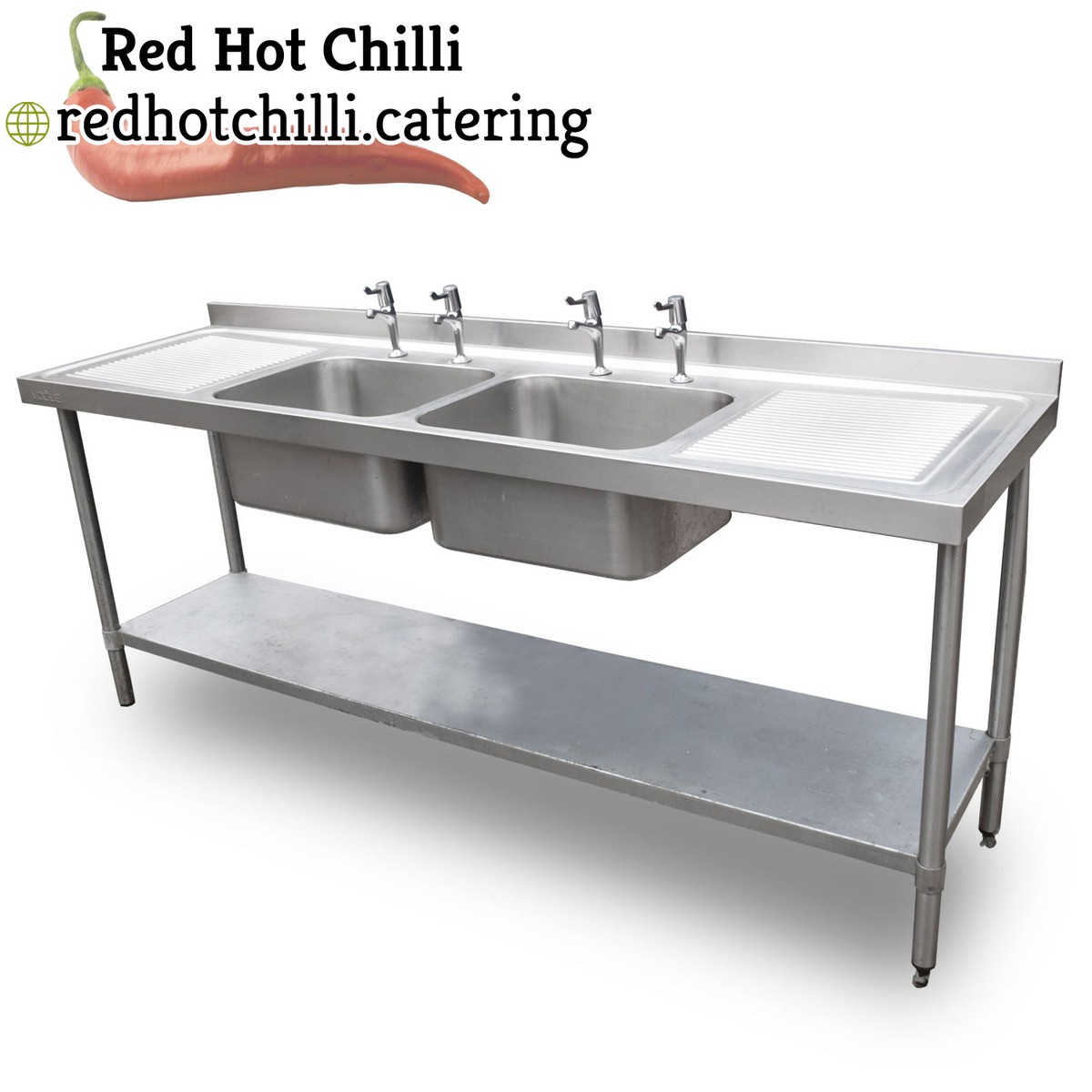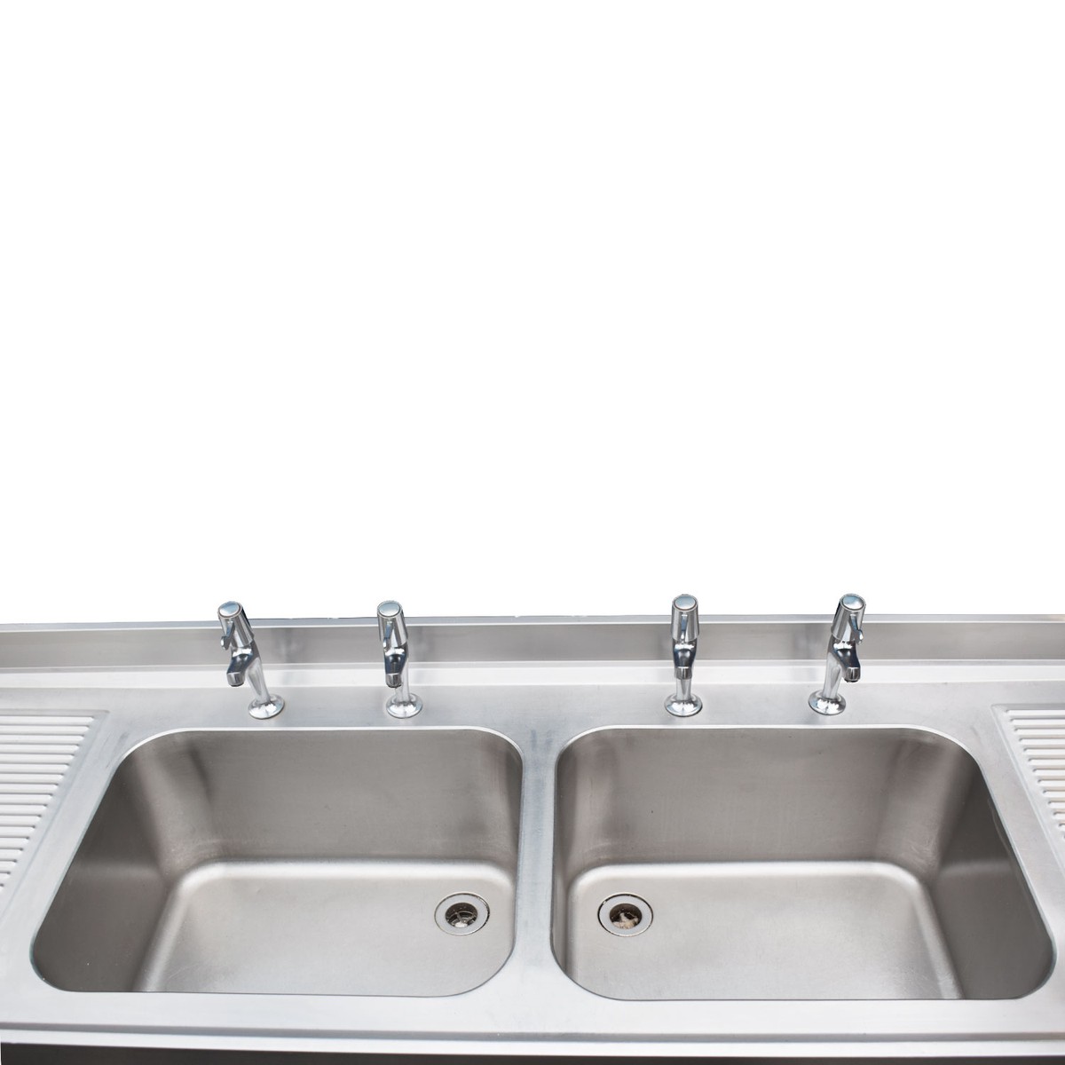 Stainless steel double sink featuring 2 large sink bowls, undercounter shelf, left and right side drain and splashback. Ideal for use in commercial kitchens.