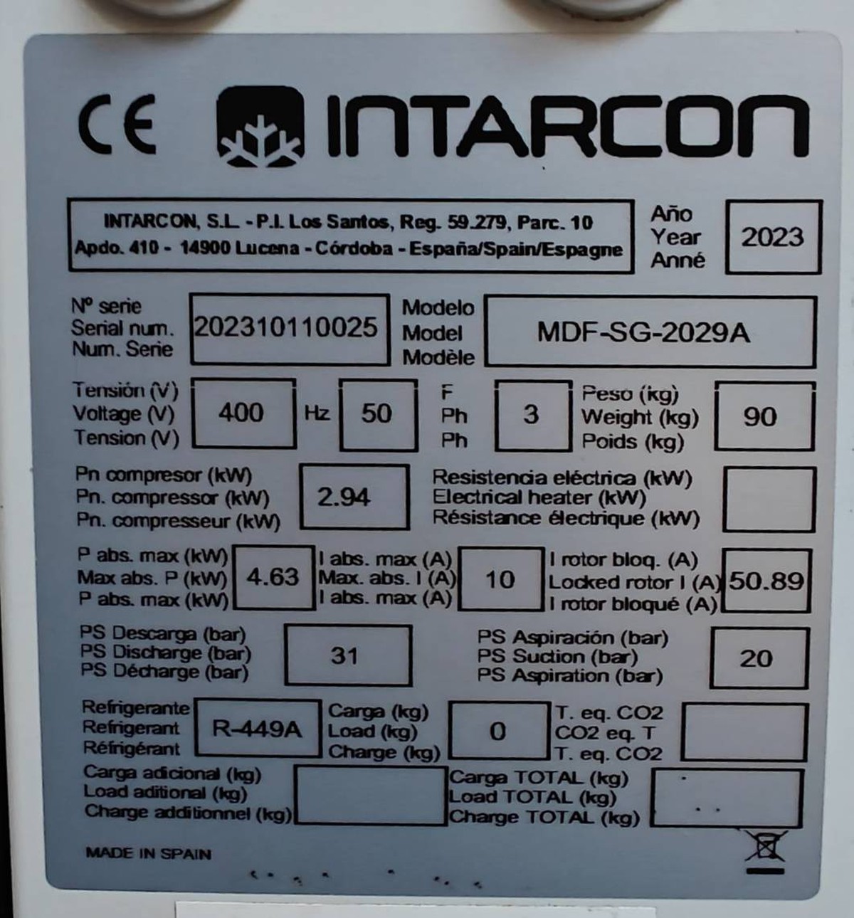 1x INTARCON MDF-NG-2029 CONDENSING UNIT Serial No: MDF-NG-2029