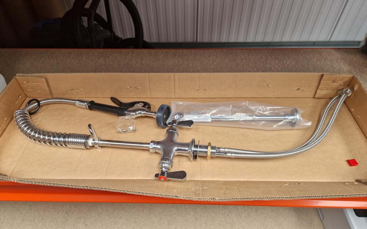 Holmes double bowl sink unit, size (w) 150cm x (d) 60cm x (h) 89.Left hand drainer to include as new unused pre - rinse spray arm.