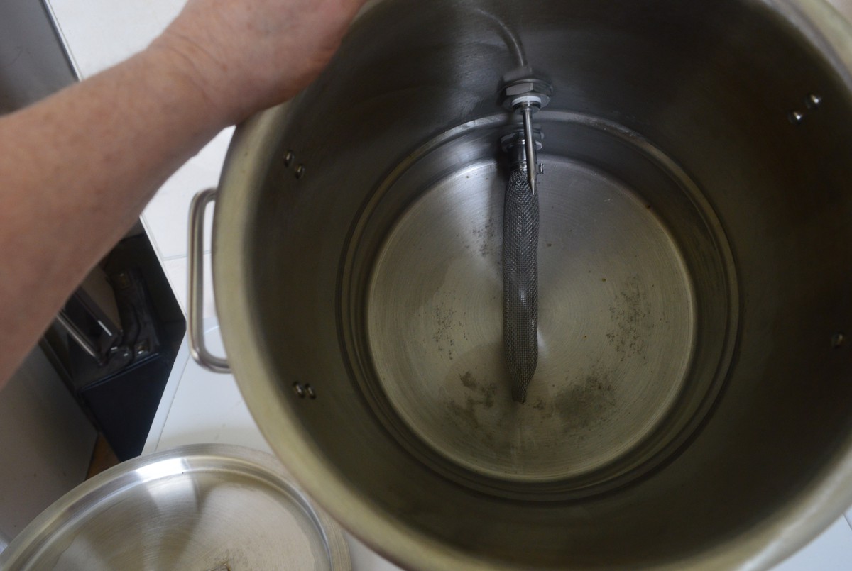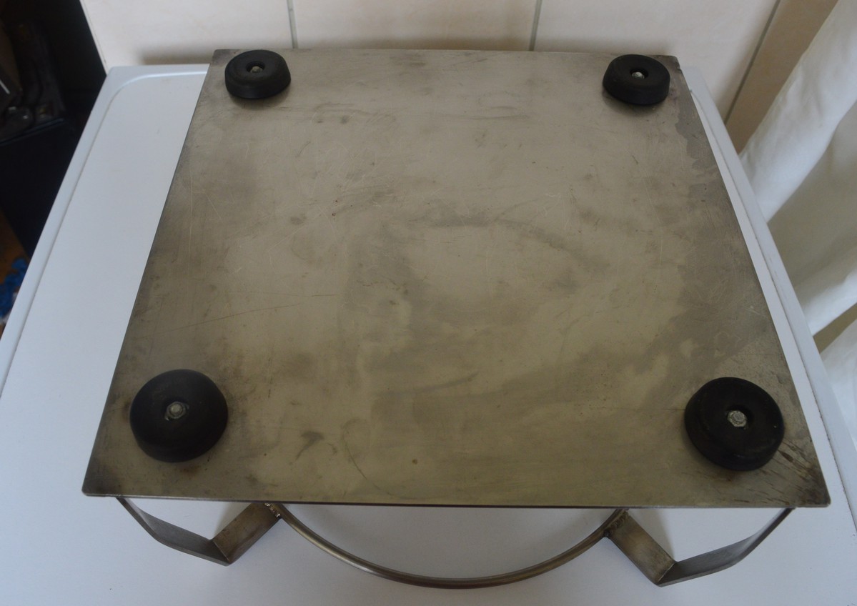 All stainless construction except the ring and has 4 large rubber feet which makes it very sturdy on any surface, a large stainless ring encompasses the pot, not going to be knocked over very easily.