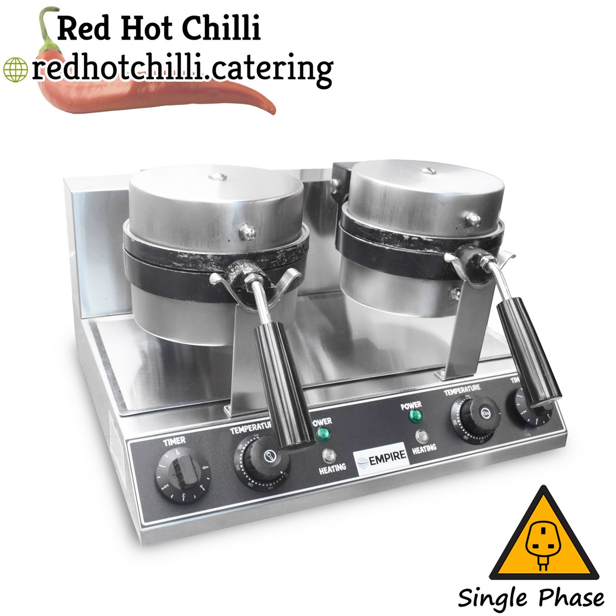 This Empire Twin Waffle Maker is a heavy-duty professional appliance designed for high-volume service. It is able to produce up to 40 Belgian waffles per hour using two independent rotating plates ensuring even batter distribution for uniform, golden waffles.