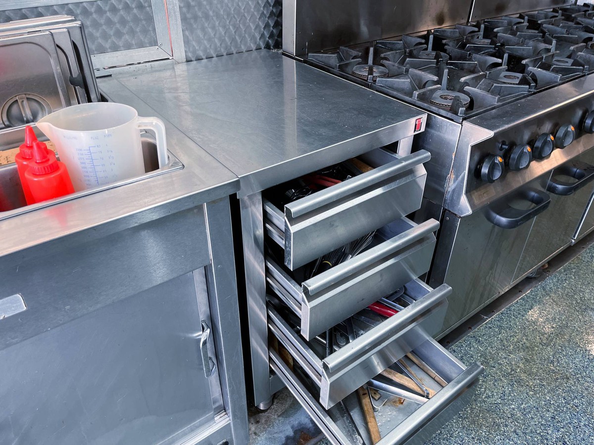 Purpose built steps and platform for serving hatch access. Steps store outside under vehicle body, easy access. Platform stores inside of the kitchen