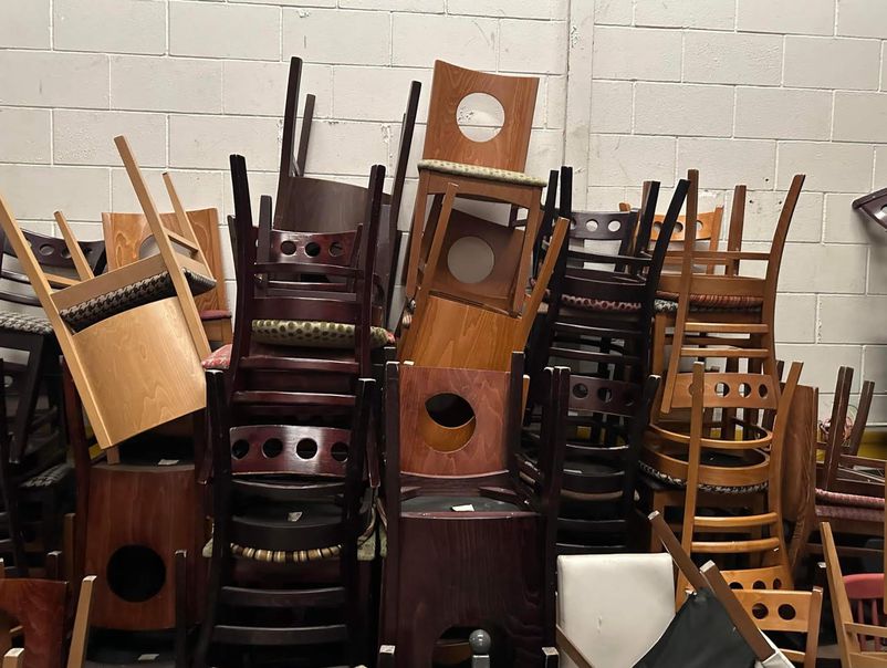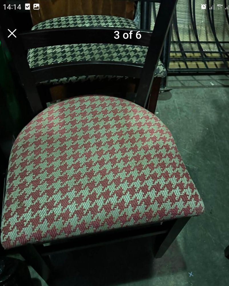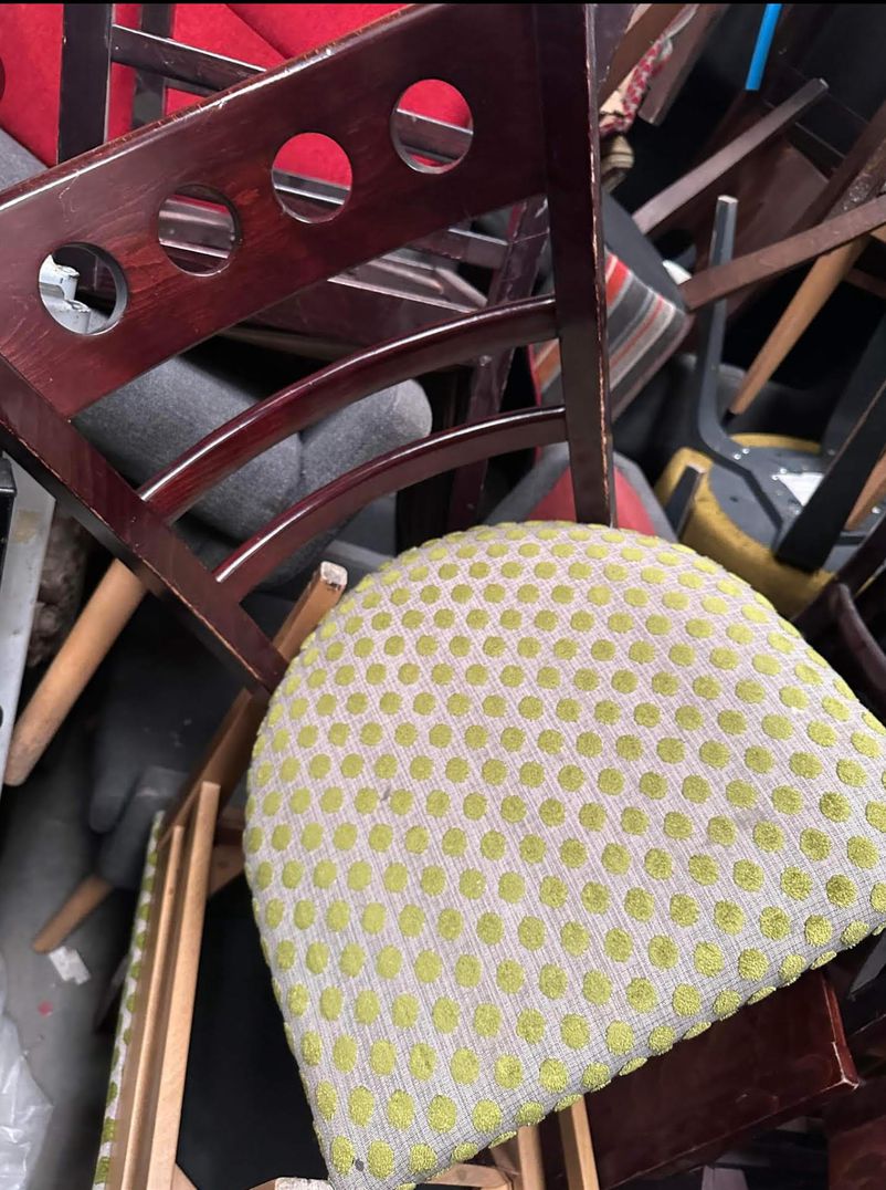 Variety of chairs in various styles including ladder back, round cut out, green spotted upholstery, herringbone fabric etc