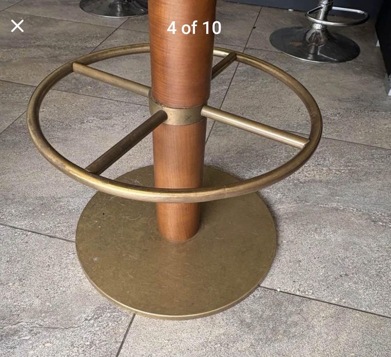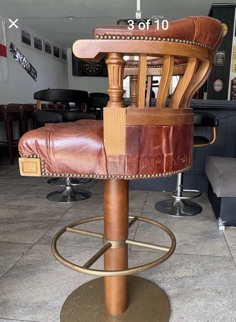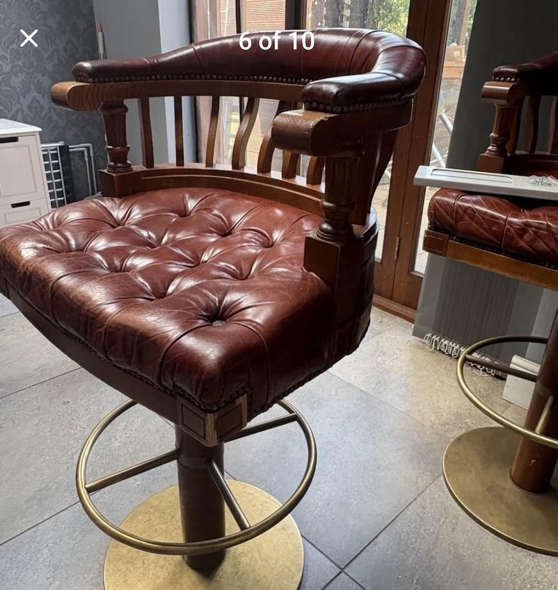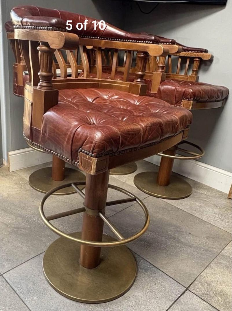 Brown Leather Traditional Bar Chairs Curved padded wooden back Captains chair style Circular brass base and footrest